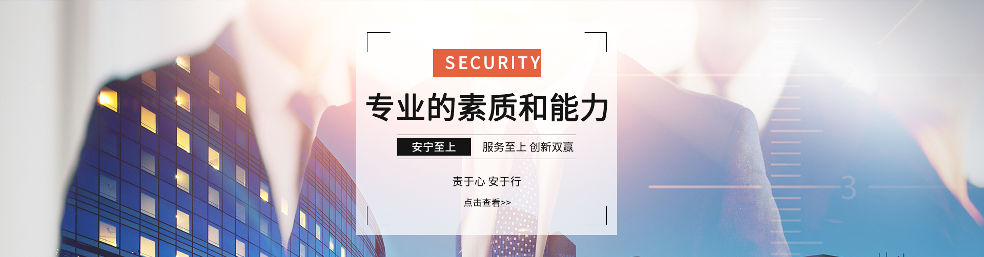 公司始終堅(jiān)持“務(wù)實(shí)、求精、效益、創(chuàng)新”的質(zhì)量方針,奉行“維護(hù) 雇主事業(yè)管理秩序,捍衛(wèi)雇主事業(yè)運(yùn)營(yíng)安全,致力于雇主事業(yè)長(zhǎng)期發(fā)展的保駕護(hù)航”服務(wù)宗旨,不斷加強(qiáng)公司管理層和員工隊(duì)伍建設(shè),以專業(yè)化、標(biāo)準(zhǔn)化的優(yōu)質(zhì)高效的服務(wù)質(zhì)量為各企事業(yè)單位提供專業(yè)的安全保衛(wèi)及物業(yè)管理服務(wù)。